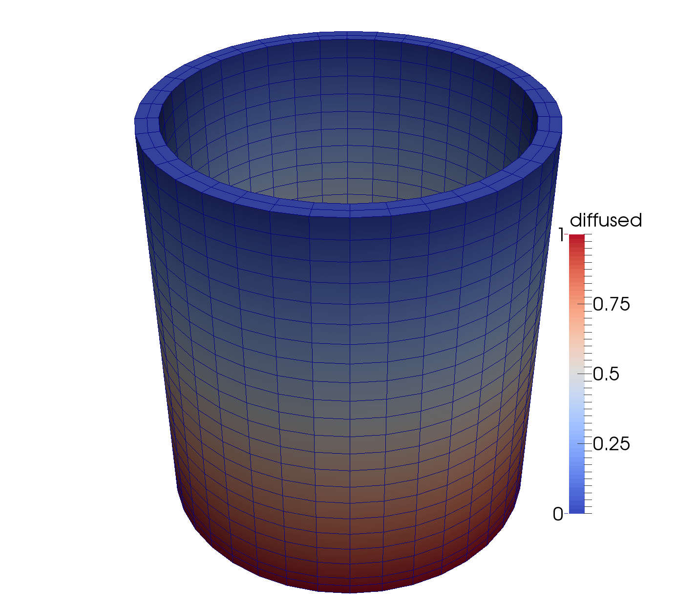 Within each of the two sub-section, named "top" and "bottom" by the user, the boundary conditions are linked to their associated variable(s) (i.e. "diffused" in this case) and boundaries. In this case, the mesh file mug.e defines labeled the boundaries "top" and "bottom" which we can refer to. Boundaries will also often be specified by number IDs - depending on how your mesh file was generated.