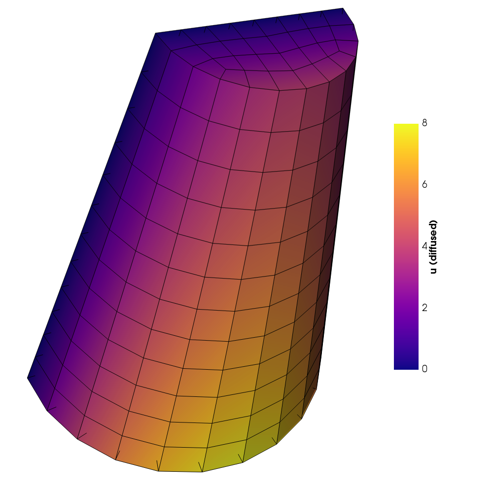 These results are from running the transient.i file. At , we can see that the initial condition defines the solution to be zero at (along the rear surface of the half-cylinder) and increasing linearly toward us (out of the page). At the final time, we see that diffusion has overcome our IC and our Dirichlet BCs have dictated the solution along the top and bottom surfaces.