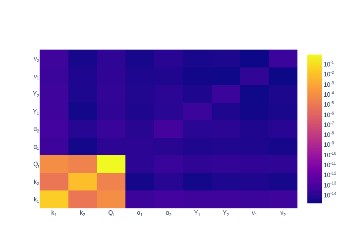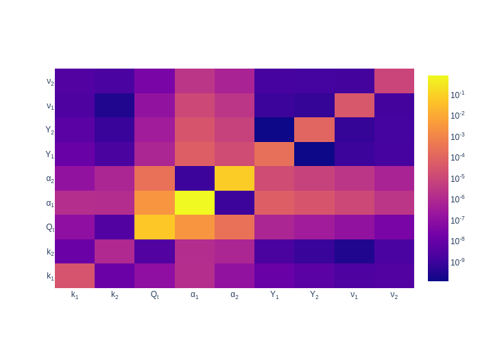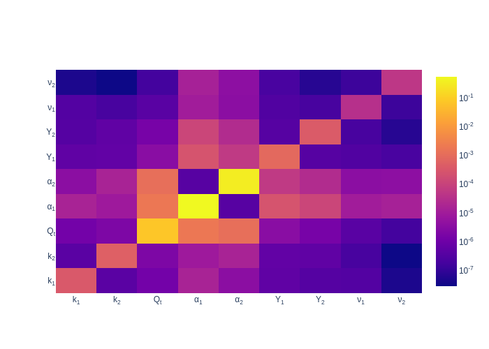 Sobol sensitivities, or Sobol indices, are a metric to compare the global sensitivity a parameter has on a QoI. This examples demonstrates several different types of the sensitivities. The first is total sensitivity, which measure the total sensitivity from a parameter, Figure 3 shows these values for each QoI and parameter. The second is a correlative sensitivity, which measures the sensitivity due to a combination of parameters, Figure 12 to Figure 14 show heat maps of these values for several QoIs.