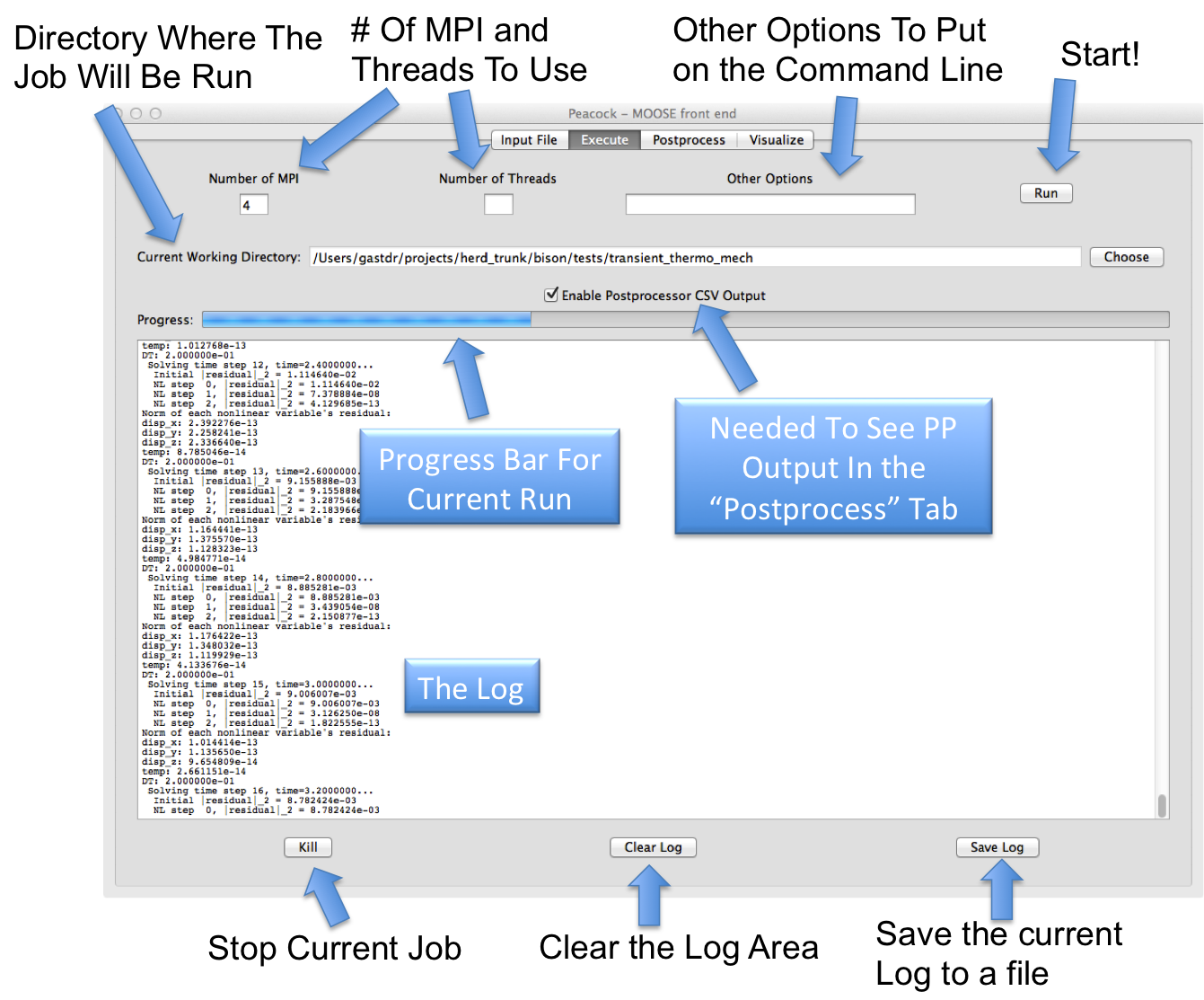 The Execute Tab (shown below) allows you to run the current application with the input from the Input Filw Tab. You dont need to save the input file first. Just edit the appropriate fields in the Input File Tab, then go to the Execute tab and click Run!