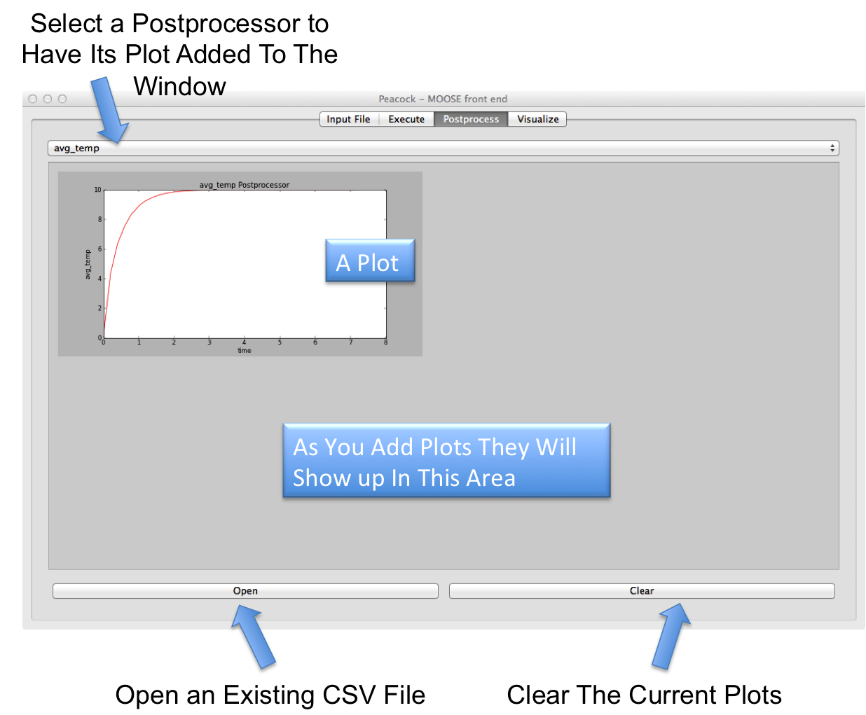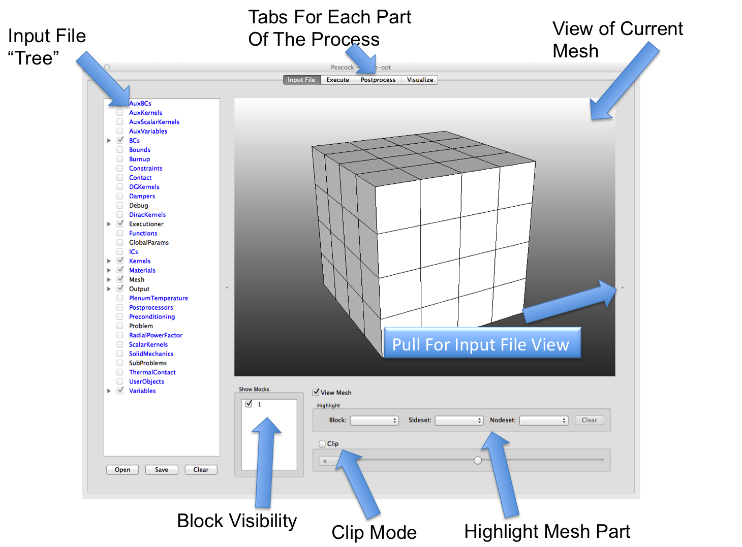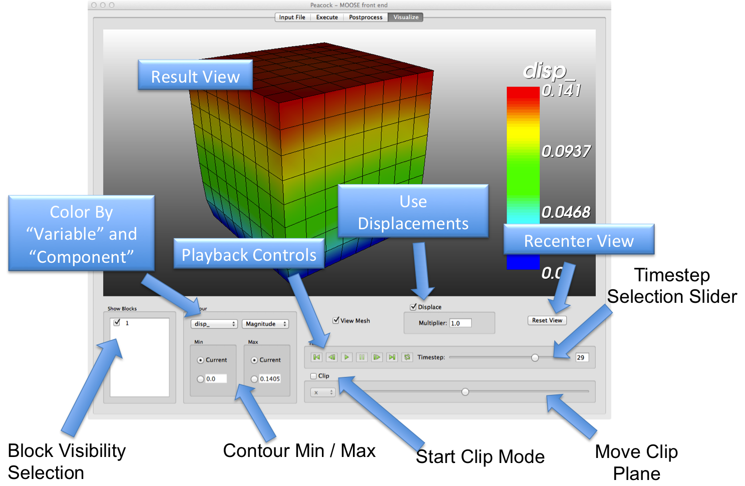 Peacock is a graphical front end for the MOOSE input file syntax. Peacock allows the user to build or modify an input file, execute an application, and view the results, all within one package.