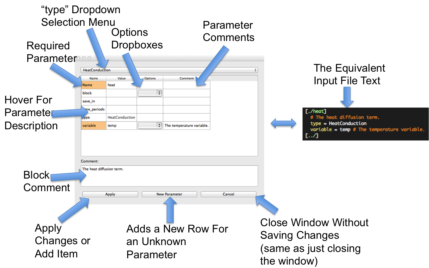 Items that are BLUE can be right-clicked to bring up a menu where you can "Add" something to that part of the input file. For instance, to add a Kernel to the input file, I would right-click "Kernel" and then click "Add..." from the pop-up menu. After clicking "Add", a new window will open, allowing you to specify the parameters for the Kernel you want to add (See the Parameter Editor section below).