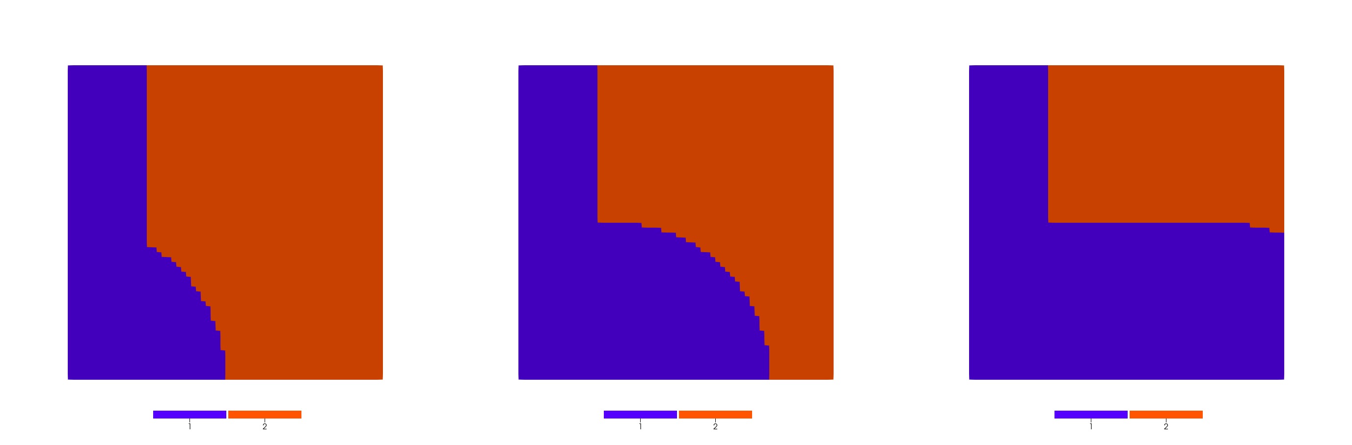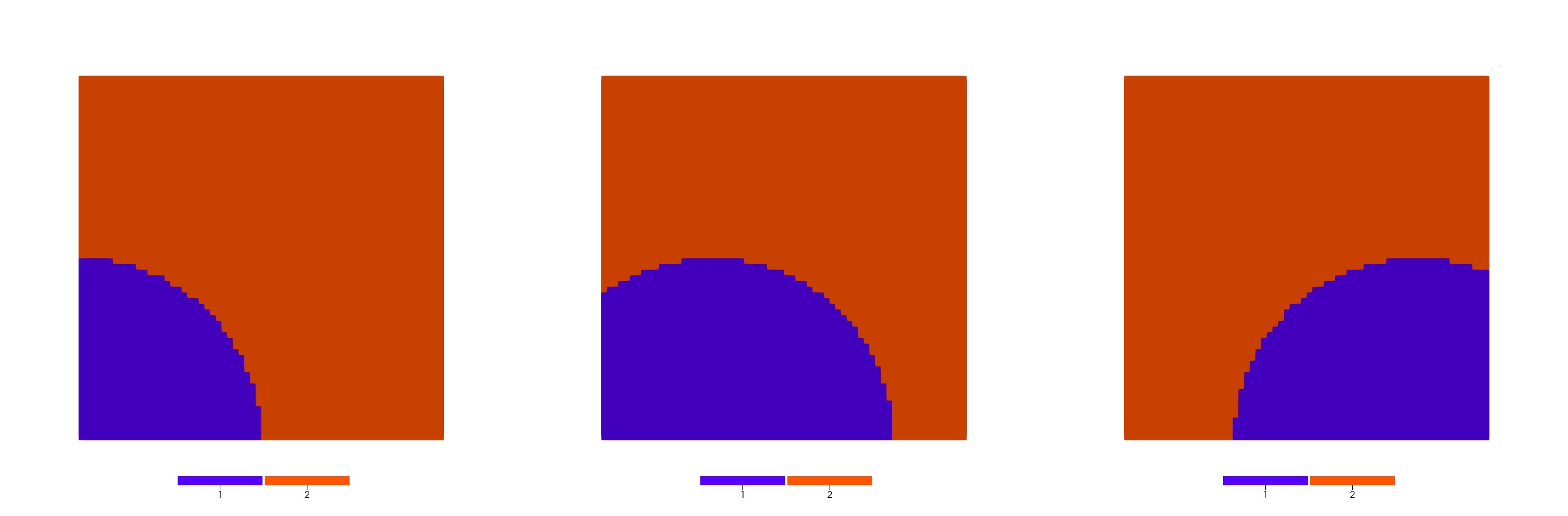 Initially, the domain is decomposed by a vertical line . The elements on the left side of the vertical line have subdomain ID of 1, and the elements on the right side have subdomain ID of 2. The CoupledVarThresholdElementSubdomainModifier is used to change the subdomain ID from 2 to 1 for elements within the circle.