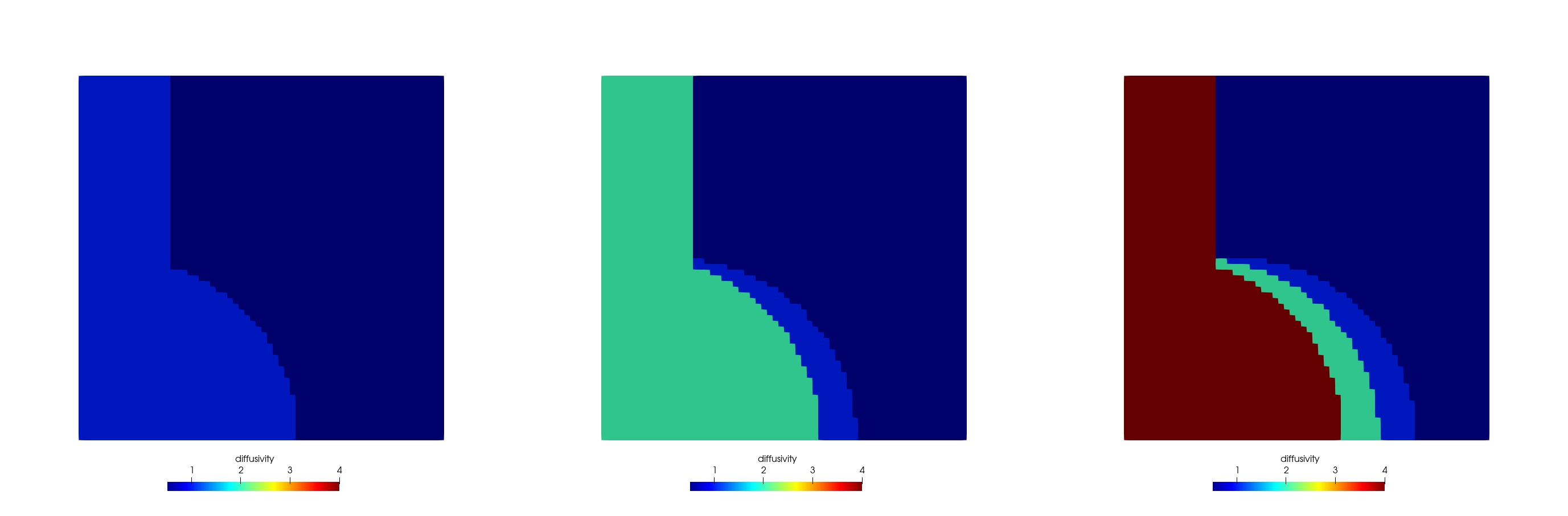 Similarly, all stateful material properties will be re-initialized when an element changes subdomain. Suppose initially the diffusivity is everywhere, and the diffusivity doubles at each time step: