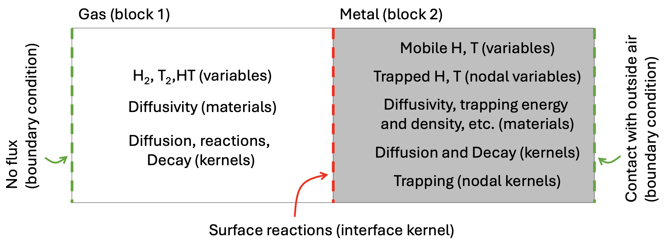 Let's assume one wants to model hydrogen and tritium transport through the metallic walls of a pipe. The model would include diffusion, decay, and reactions between diatomic molecules inside the pipe; surface reactions at the inner and outer walls; and diffusion, decay, and trapping for single atoms in the walls. The figure below illustrates the case and specifies how MOOSE's systems would apply when constructing the case in a MOOSE input file: