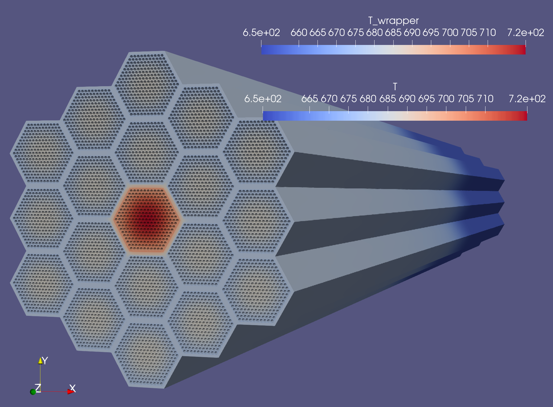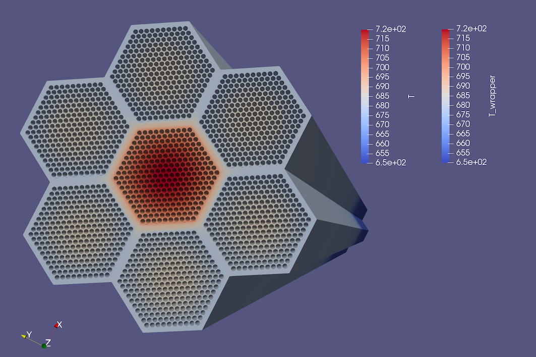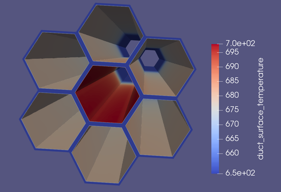 We show in Figure 4 two out of the seven SCM inner ducts. The center inner duct and one neighbor. In the 7 assembly case, the central assembly has twice the power of its neighbors. For this reason, heat flows from the high temperature, high power assembly through the wrapper/inter-wrapper domain into the neighboring colder, lower power assemblies.