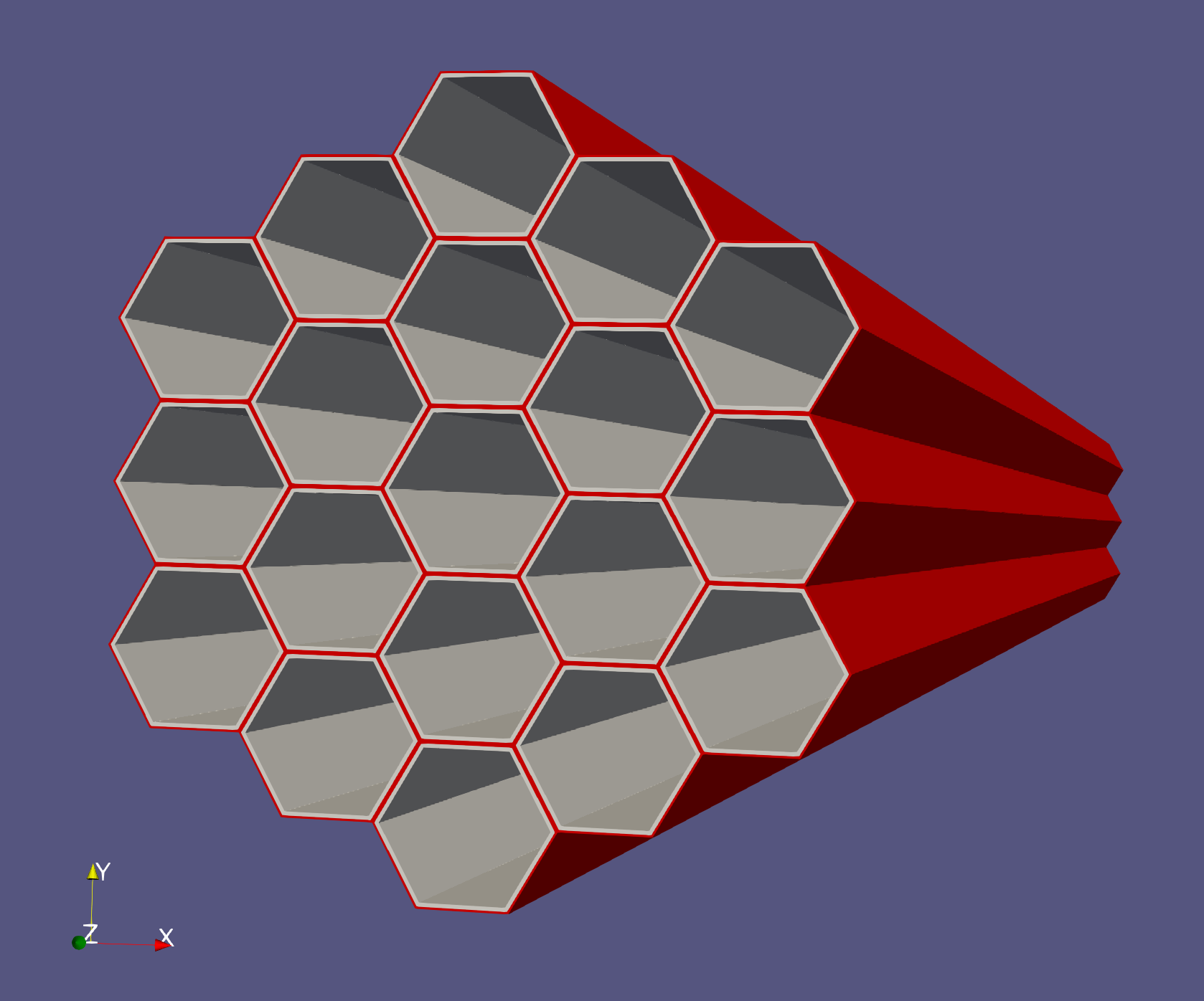 ) of the wrapper and inter-wrapper. The wrapper is the hexagonal duct that contains the subchannel assemblies and the inter-wrapper is the space in-between the ducts. A picture of the wrapper and inter-wrapper for the case of 19 assemblies is shown in Figure 1