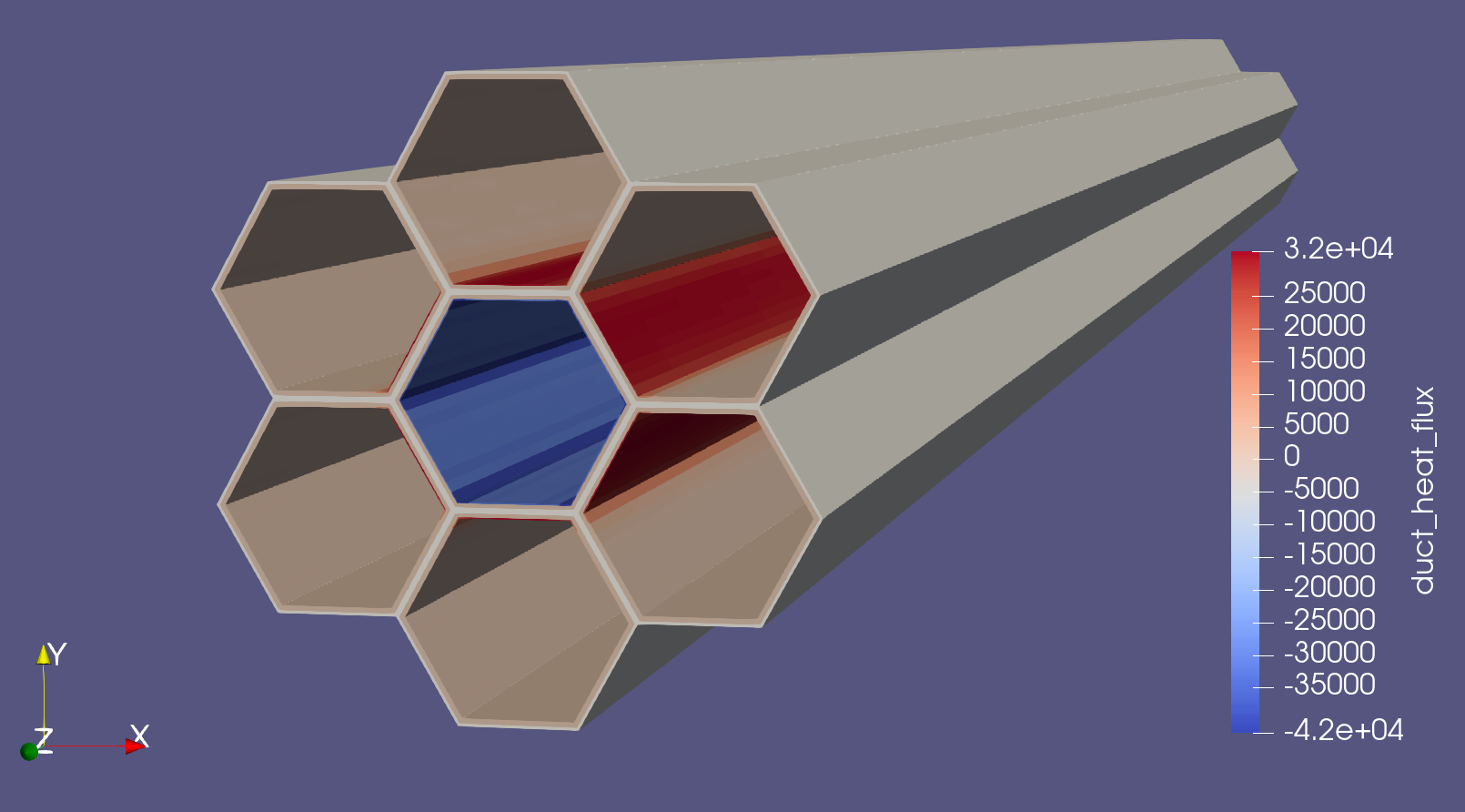 The coupling approach is that of domain decomposition. The main app calculates the temperature field in the wrapper and inter-wrapper regions. Based on the temperature field it calculates the heat-flux on the inner surface of the wrapper (inner surface of the hexagonal ducts) and transfers that information to the equivalent duct model of SCM. The calculated heat-flux by the heat conduction model for the 7 assemblies case is shown in Figure 3