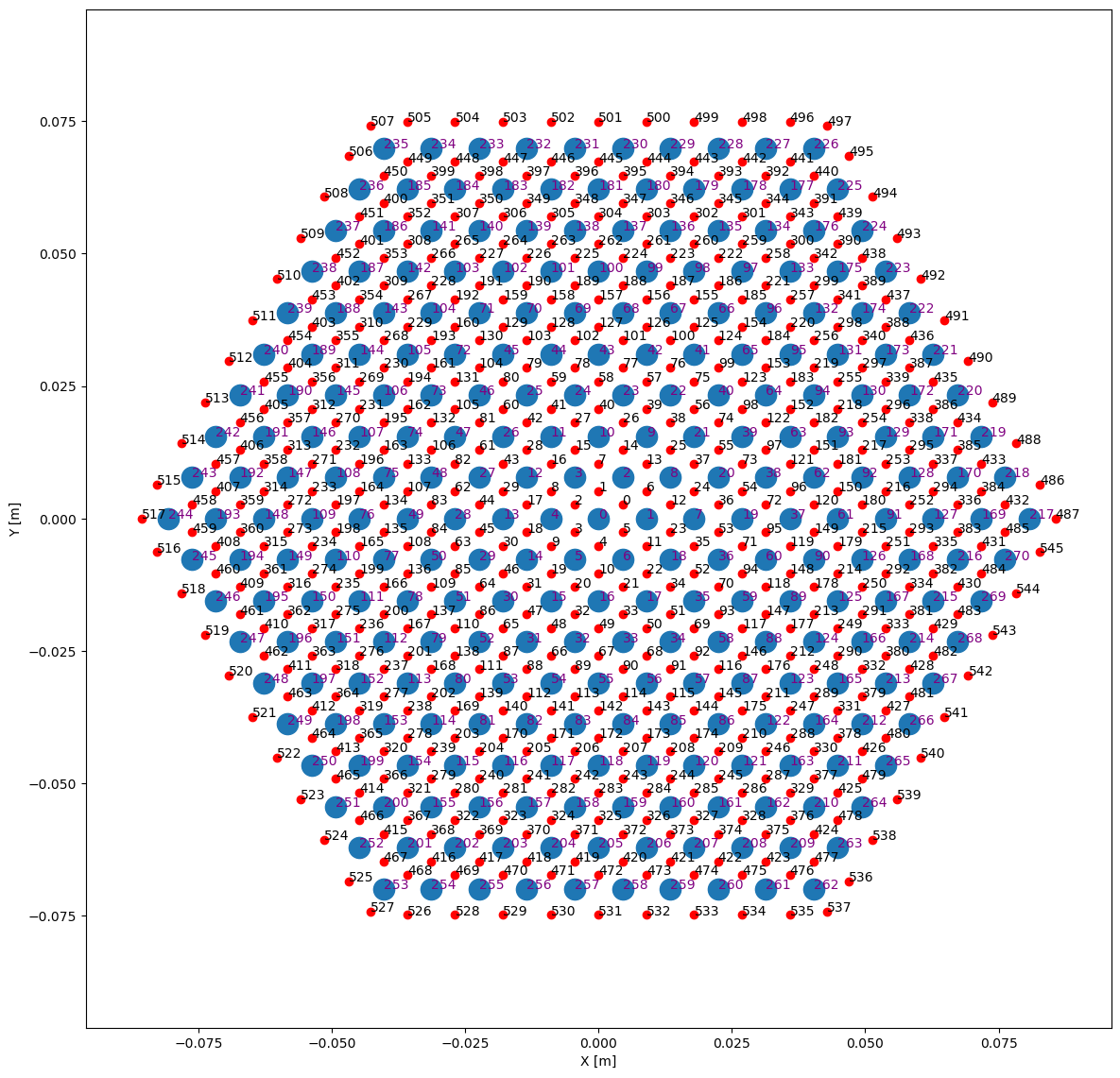 Figure 2: Index and location of fuel pin centers and subchannel centroids